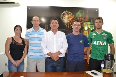 Da esquerda para a direita: Fabíola, representante dos concursados de 2012, Diogo, vice-tesoureiro da Associação, Valdemir Stobe, Presidente da Câmara Municipal, Luis, Vice-presidente da associação e Adriano, Presidente da Associação.